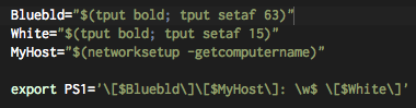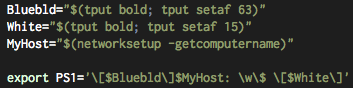 export PS1='\[$Bluebld\]$MyHost: \w\$ \[$Normal]'