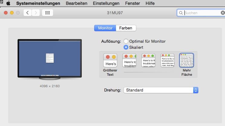 However, for routine work, the first two resolutions yield too small type, while the 2048 x 1080 is too large. Although it was not a "bold" resolution, I find the available 2560 x 1350 at 50 hz Pal/HiDPI/17:9 resolution to be sharp and easy to read.