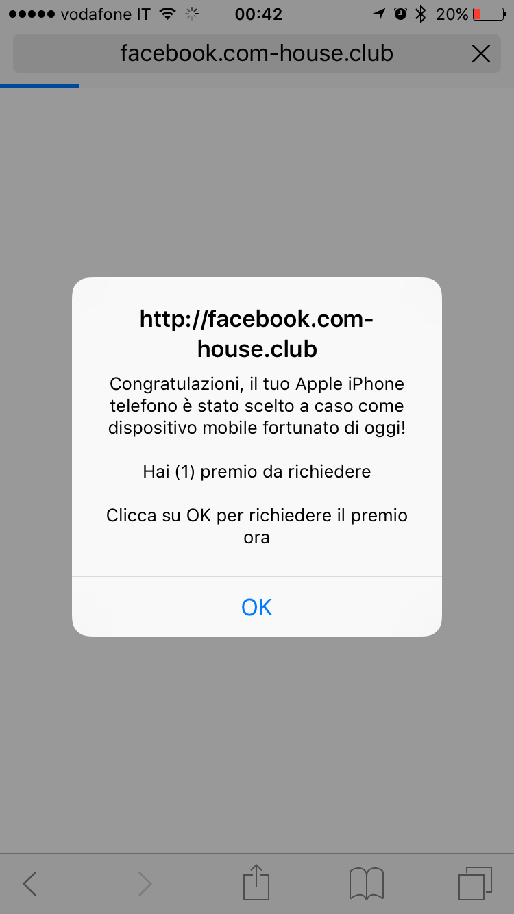 I've had a similar problem on both my iPhone and today on my iPad with something called "http://mobile-rewards.mobi/" while using Facebook claiming I'd won a prize. It looks as if legitimate by identifying me as an Earthlink customer. It gives me only the option to click OK and freezes everything else on the screen and I'm very wary of clicking on it and by googling the above address I can still get no helpful information. If I just quit Facebook, it's still there when I open it again. Today I simply fully powered down my iPad and restarted and the pop-up window disappeared. The first time it happened my iPhone though I carelessly OK but then realized it was probably not legit, and can't recall what I did and still wonder if it infected my phone somehow.