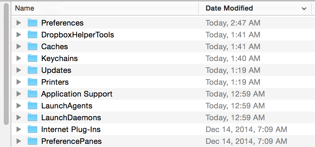 These folders in the Library folder have today's dates and times, if that matters. I didn't touch anything in dropboxes, keychains, or printers, and don't remember changing applications support. There are files in each of these folders that have been changed but I didn't see anything that would look suspicious.