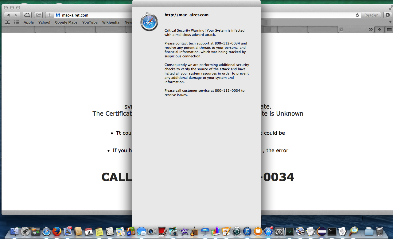 5) Safari, and pretty much all web browsers force you to attend to the button on a popup before it will let you do anything else. Which is why you can't get to the preferences or other tabs. So there you are, stuck in a loop of closing the popup, only to have it immediately display again. The crooks are using a simple built-in function of all web browsers to make your web browser appear to be stuck. No malware of any kind is necessary to accomplish this. Just a browser with JavaScript enabled. And it pretty much has to be on in order to use virtually any web site.