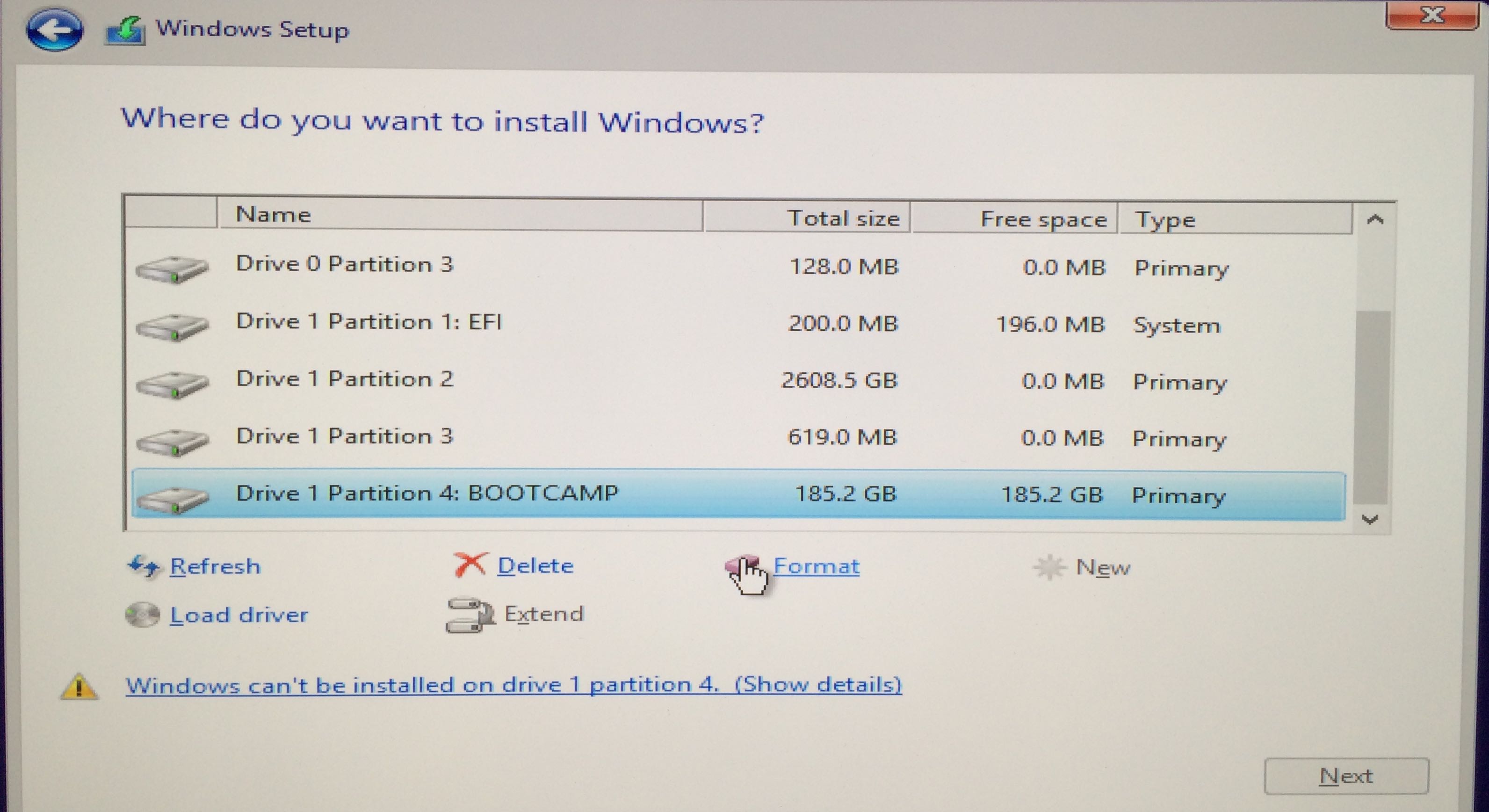 Only one button "Format" to click to make the format NTFS. Confirmed I wanted to format, saw a brief spinning wheel, then supposedly formatting was done. Now Drive 1 Partition 4 lost the "BOOTCAMP" name and displayed no name. The "Next" button wouldn't do anything. I was stuck!