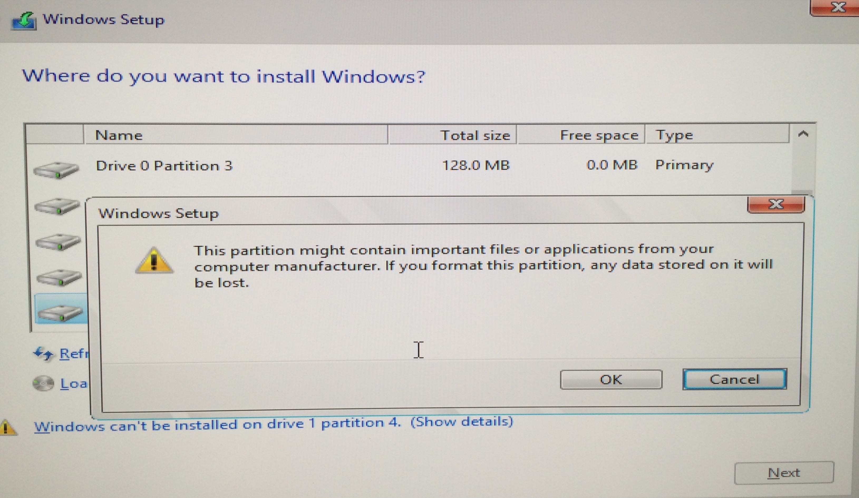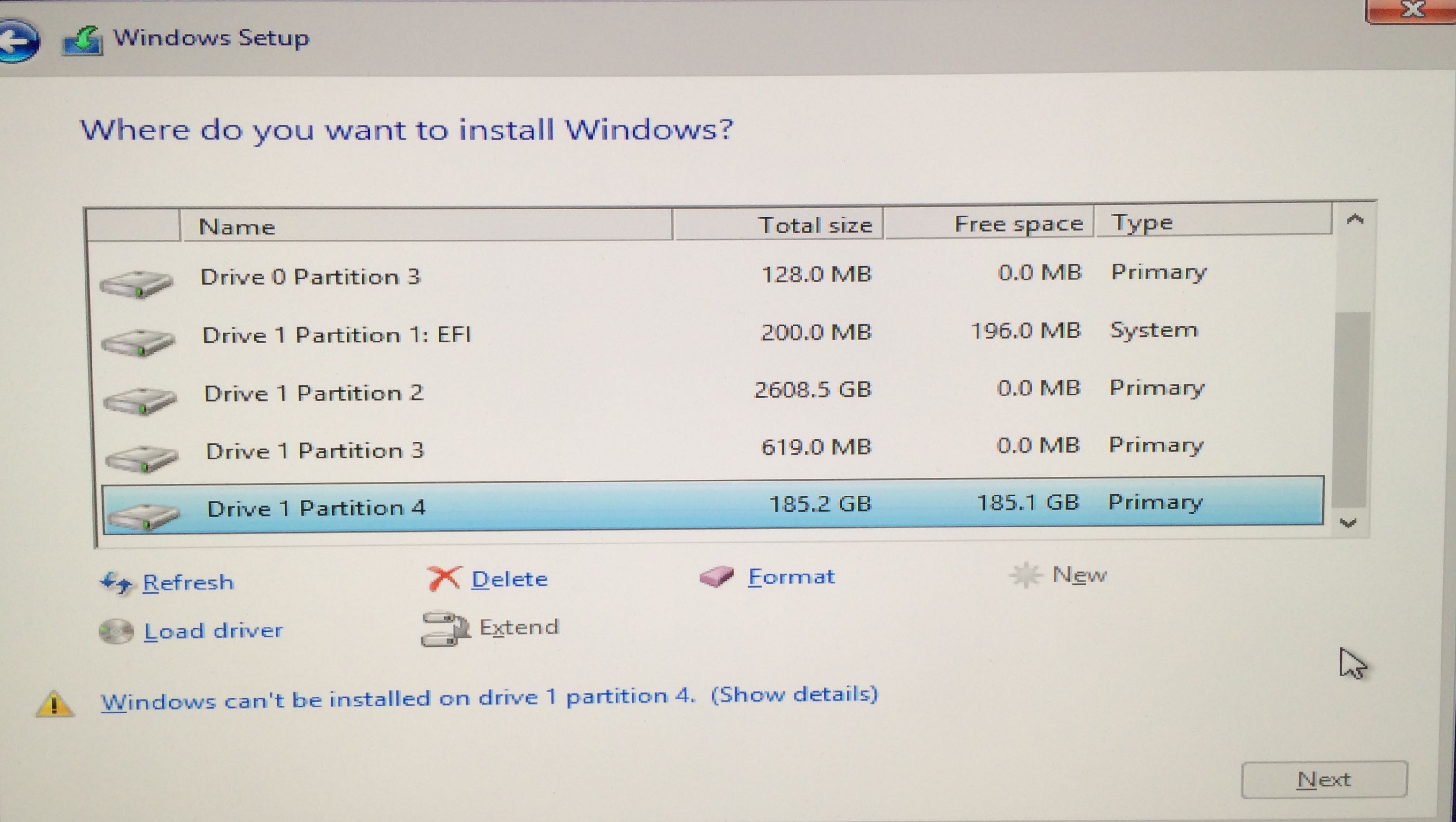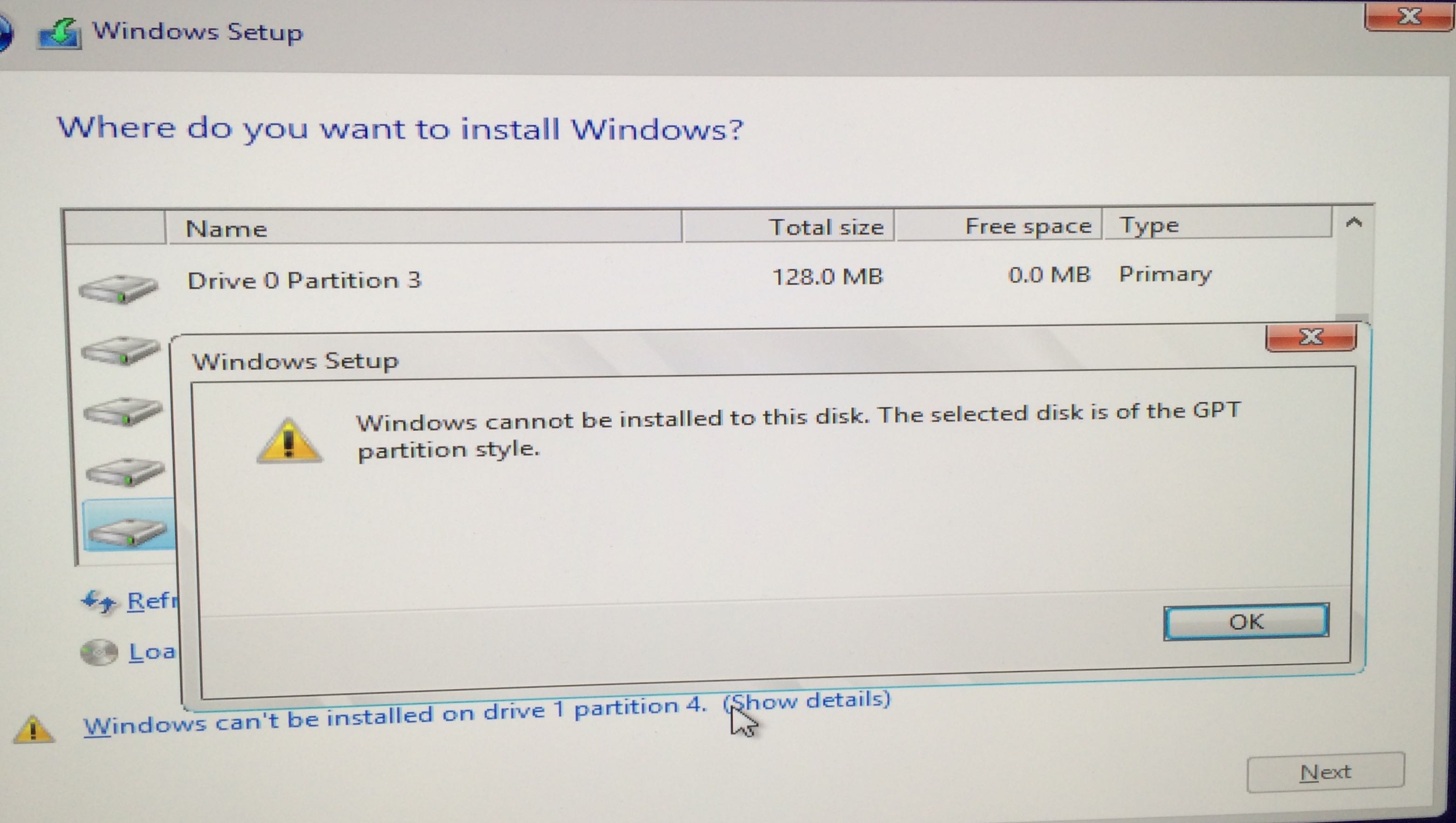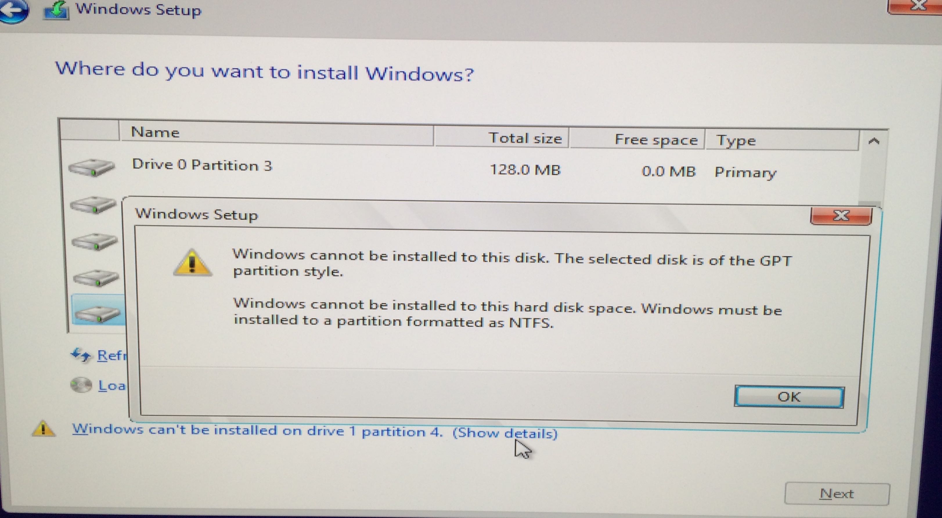 Assistant downloaded the drivers, created the BOOTCAMP partition, then I got into the Win 8.1 installer. Reached a screeching halt when the installer got to the point of selecting where Win 8.1 would be installed. Got the error message about BOOTCAMP partition not being an NTFS drive.