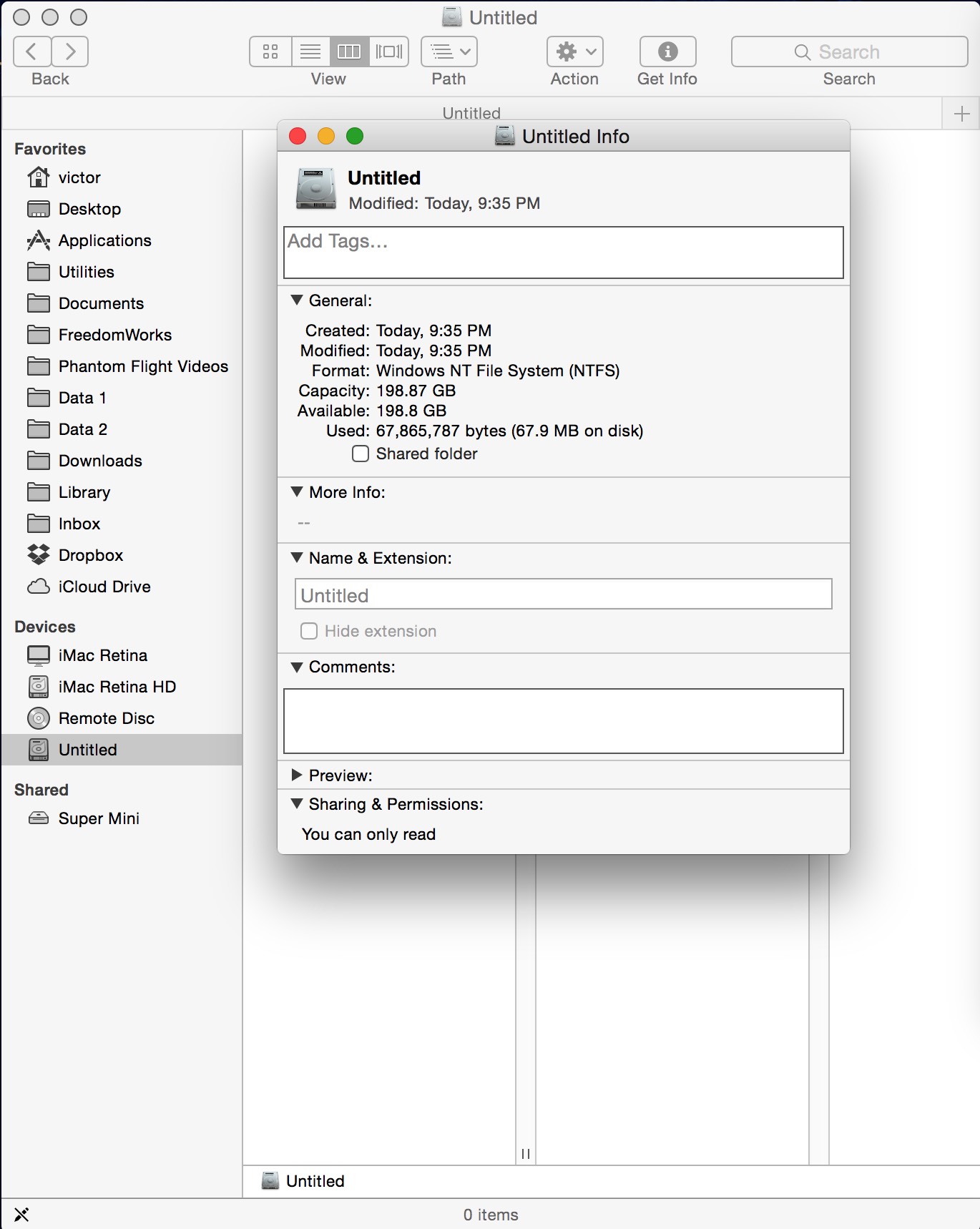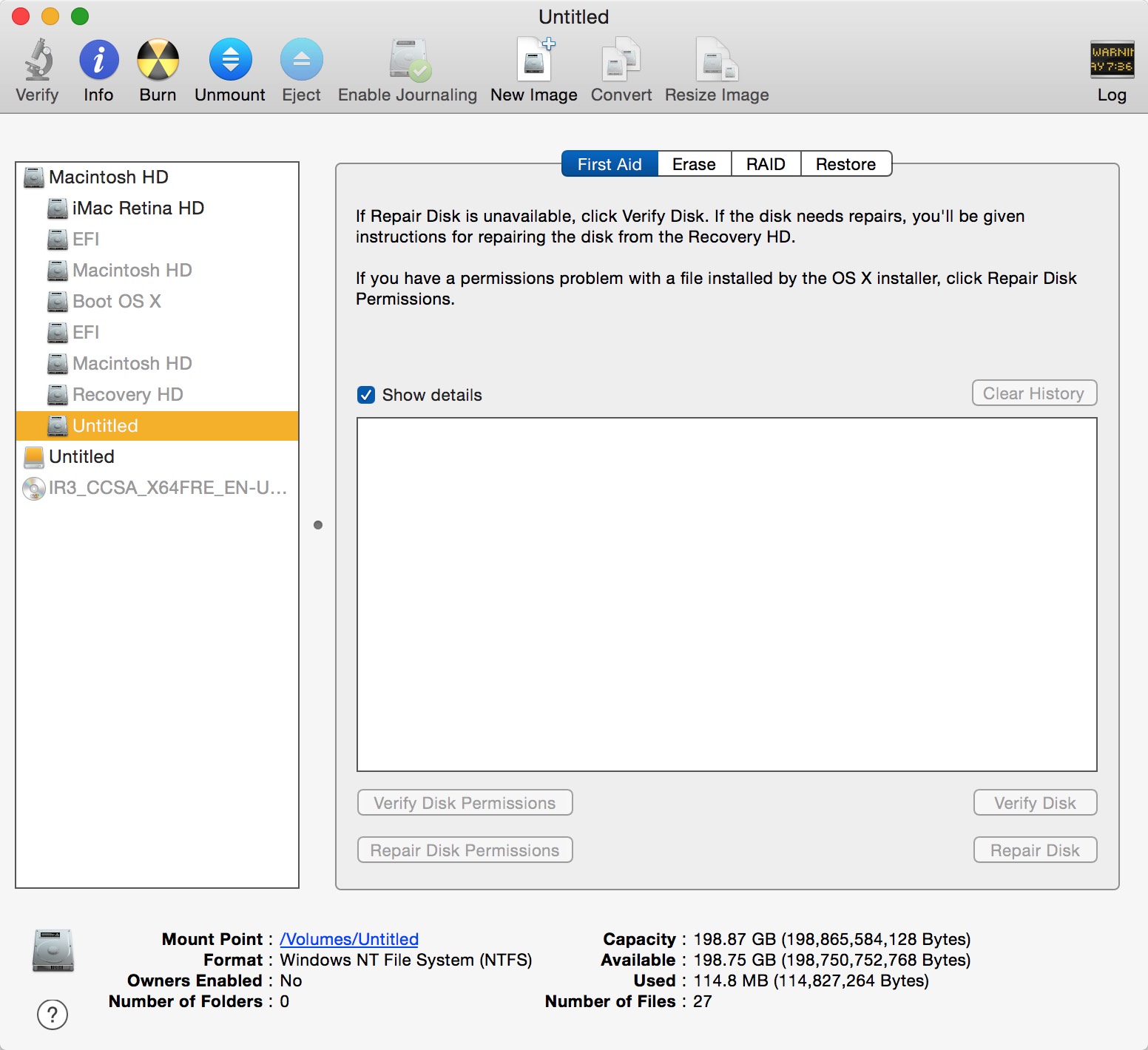 So no go on installing Win 8.1! Booting back into Yosemite and opening Disk Utility I see the Boot Camp partition, now named "untitled," identified as an NTSF volume!