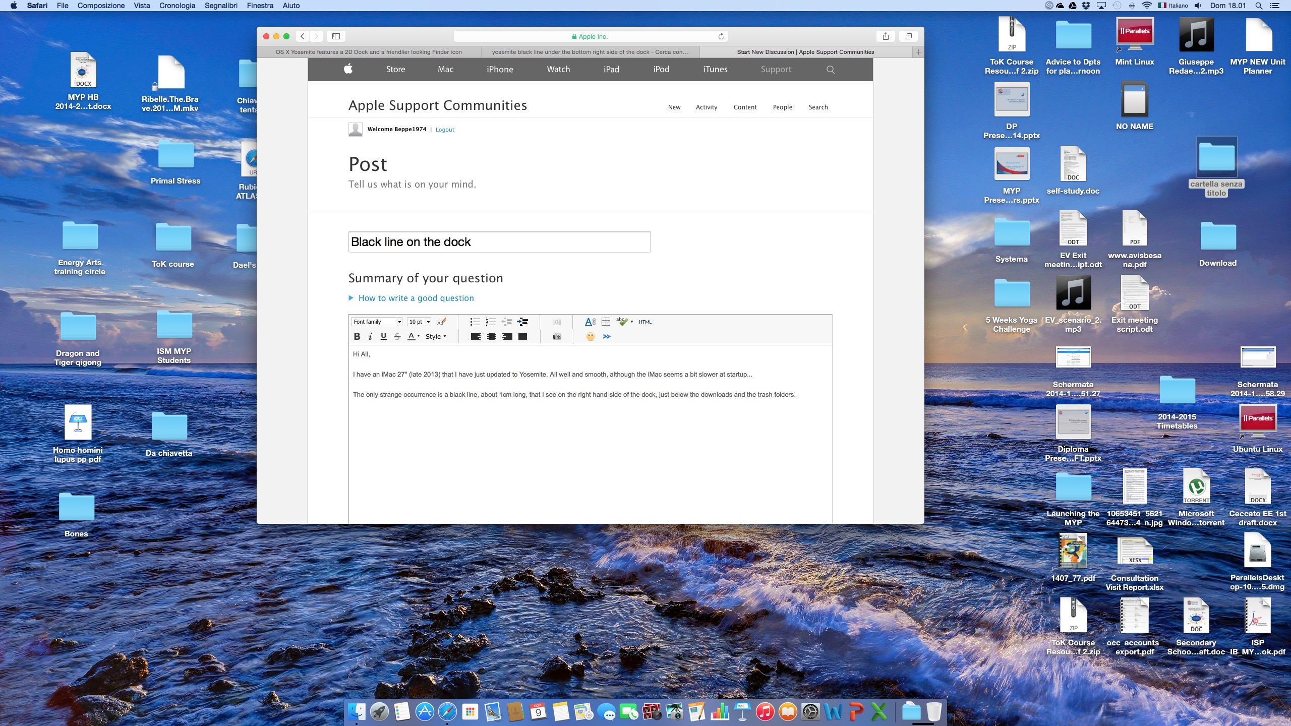 The only strange occurrence is a black line, about 1cm long, that I see on the right hand-side of the dock, just below the downloads and the trash folders: