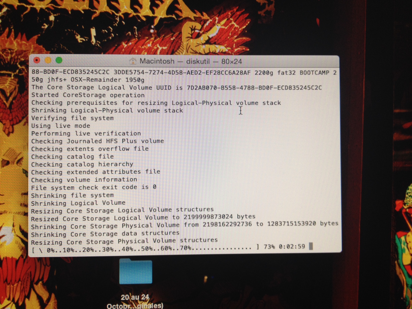 Macintosh$ diskutil cs resizeStack 7D2AB070-B558-4788-BD0F-ECD835245C2C 3DDE5754-7274-4D58-AED2-EF28CC6A28AF 2200g fat32 BOOTCAMP 250g jhfs+ OSX-Remainder 1950g