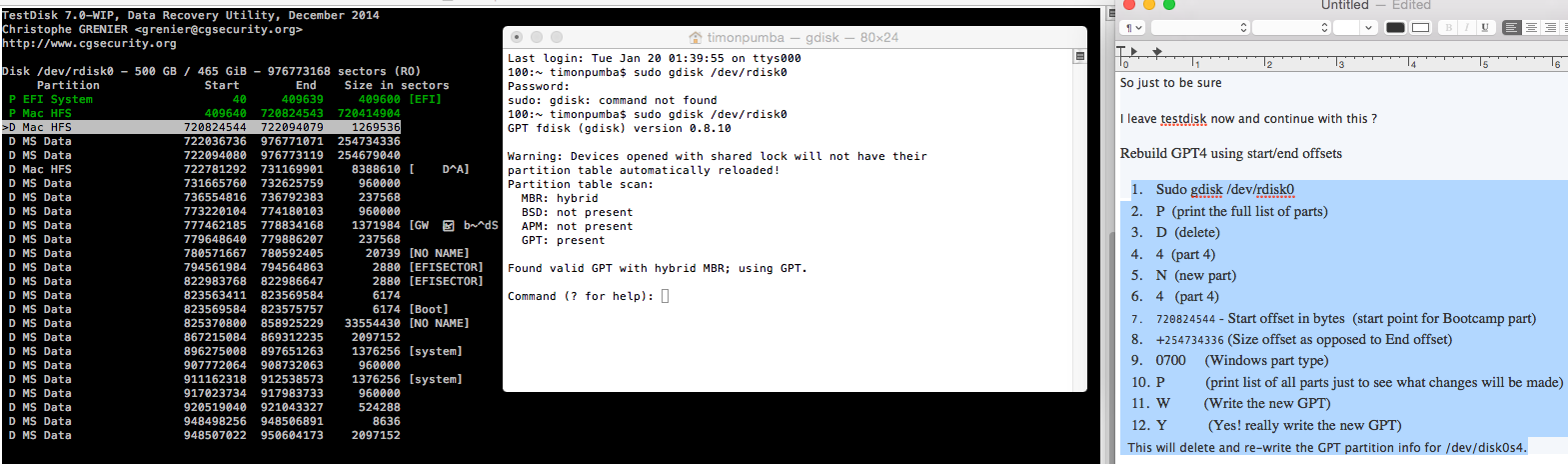I lost my windows7 boot camp after I upgrade to Yosemite from mountain lion. When I press ALT when rebooting there is no more alternative to boot for window anymore. I did read some thread about this but my case is different since when I tried to type 3 steps(diskutil.......etc) 😕 as LonerT user answers it did not work. The attached files here are what I faced with. Please help. I have a lot of important files in windows