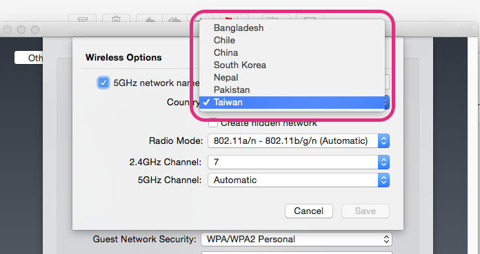 Sorry if this doesn't help, but what about changing the country code on the Airport?