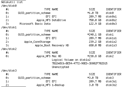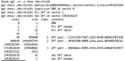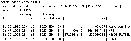 sudo dd if=/dev/rdisk0s3 count=1 2>/dev/null | hexdump -C
