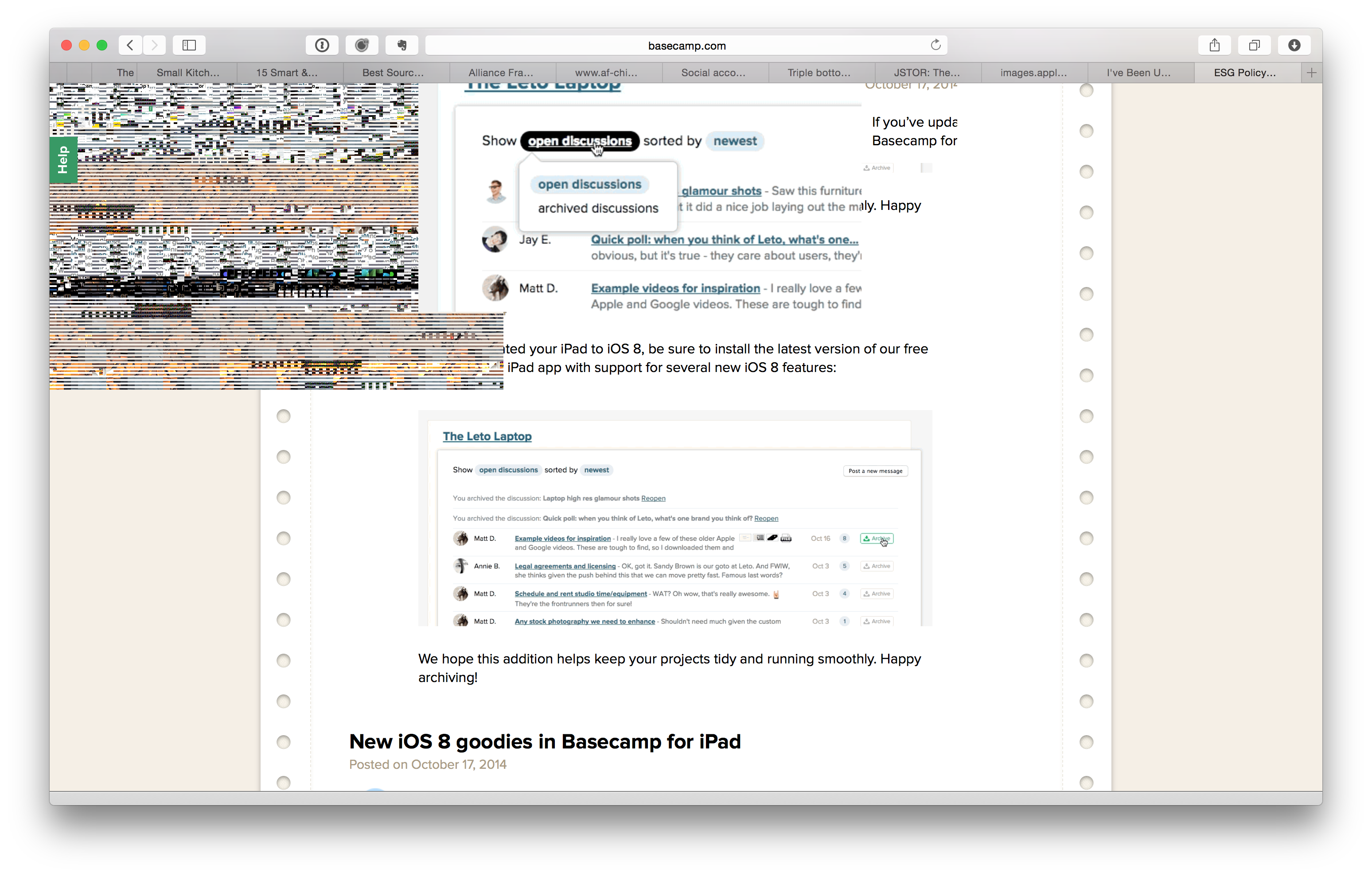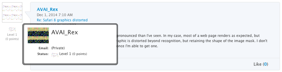 In Safari 8, ever since the Yosemite Beta and continuing through OS X 10.10.1, Safari Version 8.0 (10600.1.25.1), on occasion web pages will start to show PNG graphics as distorted. Quitting and restarting Safari clears the problem. I've not seen the issue in other browsers. Anyone else see this? Any ideas for a fix, or is it a problem with Safari 8's rendering engine and perhaps its compatibility with certain graphics cards?