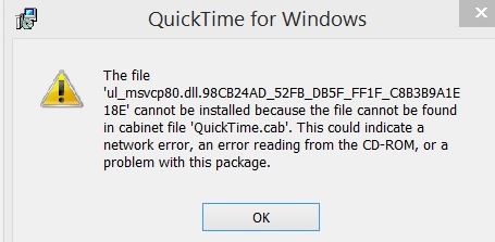Purchased a Windows 8.1 laptop for my wife and kids. I am attempting to install QuickTime and keep running into the an error about a missing file in the installation cab.