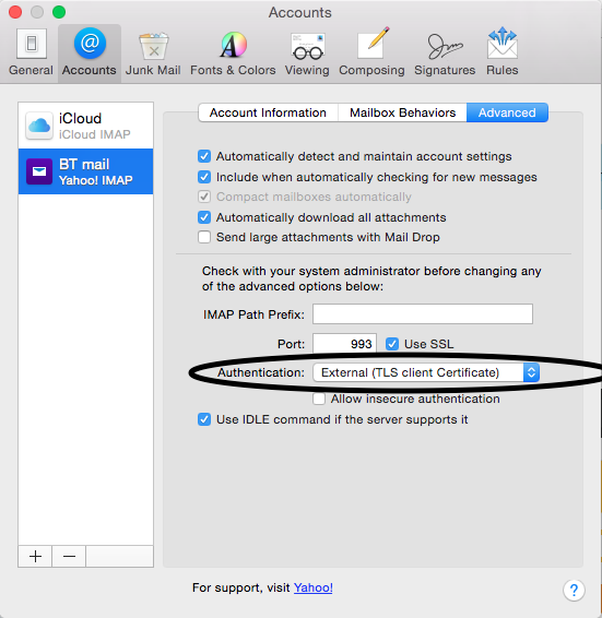 The Apple System Preferences insists that the old BT/Yahoo mail, be installed, in spite of BT's saying it has been moved to their new system.