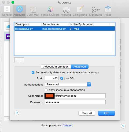 The Apple System Preferences insists that the old BT/Yahoo mail, be installed, in spite of BT's saying it has been moved to their new system.