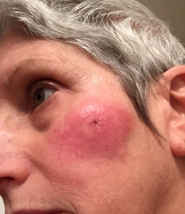 I went to a dermatologist who took a biopsy (note the black dot) and determined that I have a contact dermatitis to something that I put against my face. Guess what? It is completely gone now, but I can only talk on speaker phone or with my ear buds. The slightest touch to my cheek and it comes back. This thread has been helpful, as perhaps I will go back to the iPhone 5 or even try a different 6??? Thoughts?