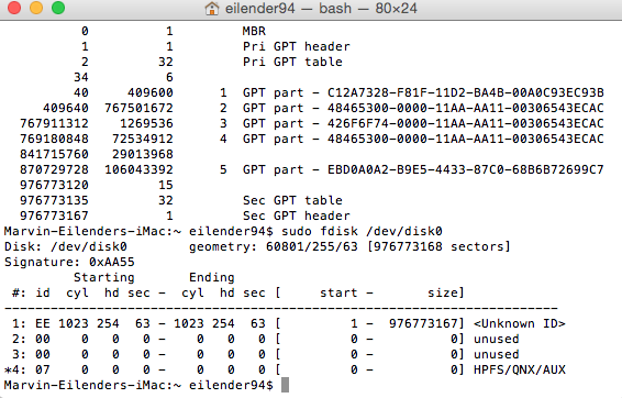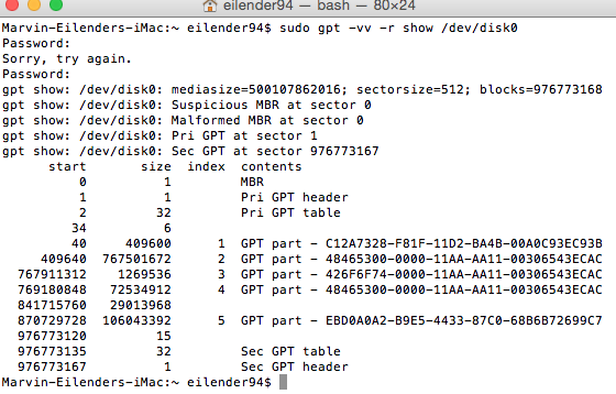 gpt show: /dev/disk0: Pri GPT at sector 1