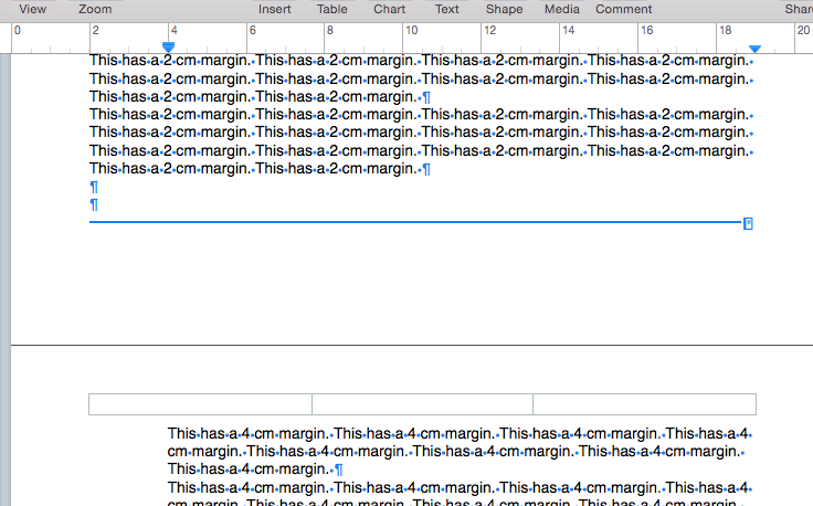 Now click into the second page and type a couple of paragraphs, followed by a paragraph return. Select all of that text (but not the section break) and change the margins in the ruler. You can also drag the first-line indent control (a small rectangle) separately from the overall indent control (the triangle).