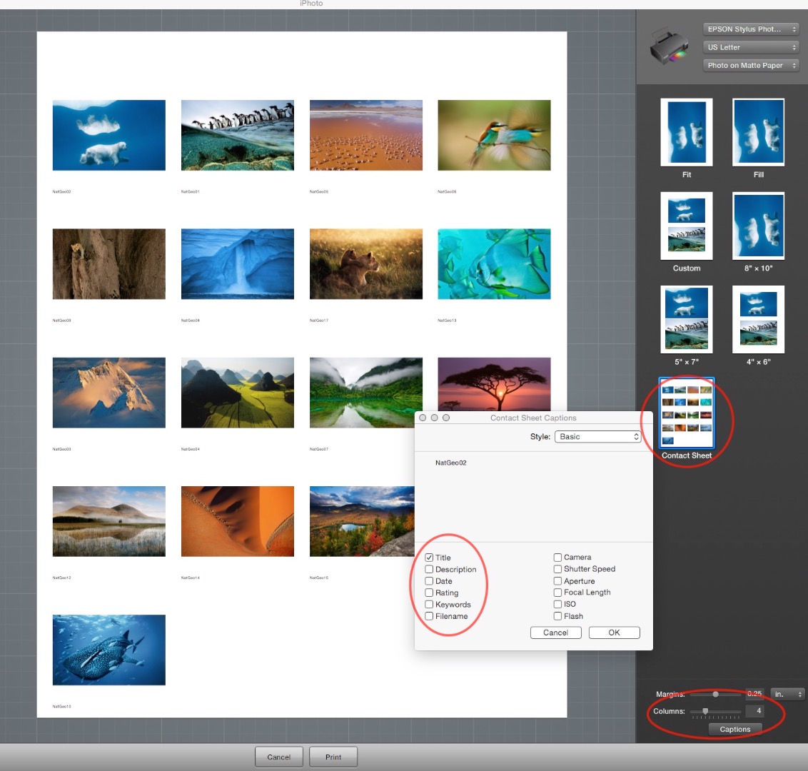 select the photos and print - In the print layout options select contact sheet = then you can select margins and number of columns and types of captions to meet you nees
