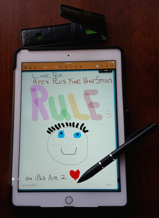 - March 2, 2015 poster by the name of "Tuxis 1" mentions LyncTek Apex Plus Fine Point Stylus. Concludes with analysis that the PLUS version should work with iPad Air 2. I contact LyncTek, the friendly customer service rep emails me right away and assures my that the stylus indeed works with iPad Air 2...AND...it is not a Bluetooth device. That means no constant connection with iPad Air 2. In total disbelief I order the stylus. $20 less than piece of junk Adonit Jot Script, no shipping charges either. So to give them additional revenue I add to the order the carrying case as well.