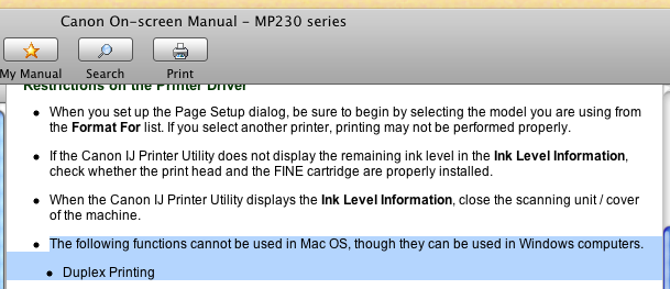 I'm currently running OSX 10.9.5 on a mid-2013 MacBook Air and have hooked it up to a Canon Pixma MP230 3-in-1 printer. This printer has a built-in manual two-sided printing function, where the user flips the pages for the printer to print on both sides. This feature was working great right about until a few months ago, and suddenly the option is no longer showing up when I attempt to print out of Google Chrome, nor is it available when I try to print using the personalised printer dialog.