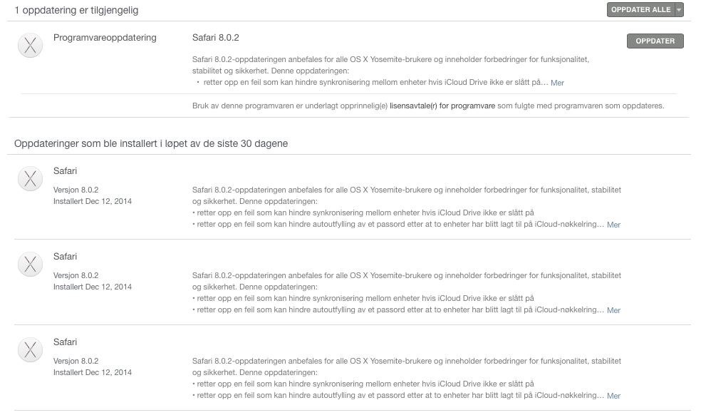 Running Yosemite 10.10.1. The Safari 8.0.2 will not install. Says it has installed several times in the App Store but is also still available for download. Have checked Safari itself and the version is still 8.0.