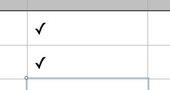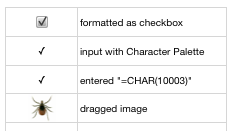 id like to input a tick in cell. Using excel this would be the marlett font and letter 'a'.