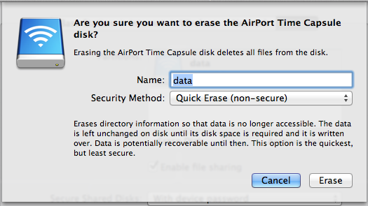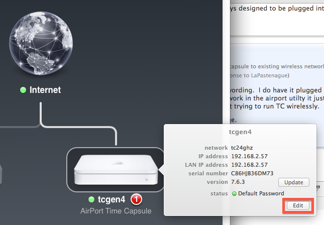 Connect a single Mac to your Time Capsule using an Ethernet cable plugged in to one of the Time Capsule’s LAN ports. On the Mac, turn off Wi-Fi to ensure that you’re only connected to your Time Capsule and then launch AirPort Utility. Select your Time Capsule from the window and press Edit.