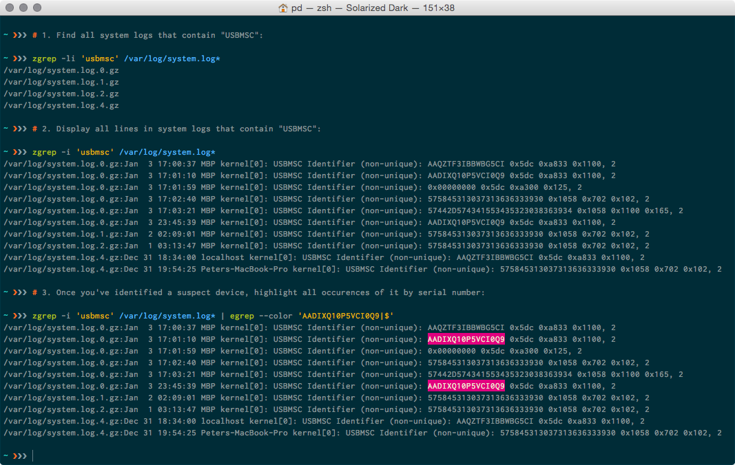 If you want to list only the lines that contain the suspect device’s serial number, type the following and press the Return key: