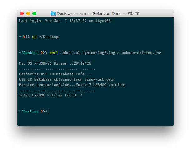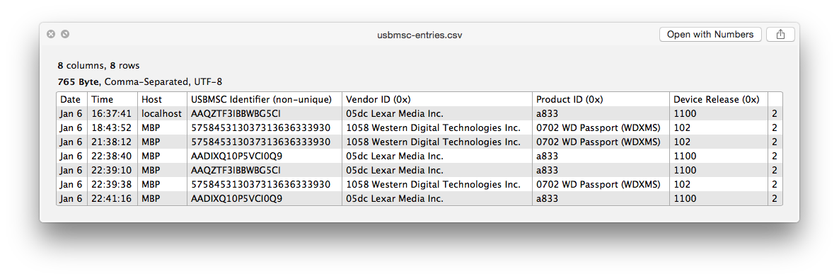 To match the Vender ID code, Product ID code, and Device Release Number to their named entities, you can manually look them up on a online repository. There are a few, and they are all incomplete and may not be up to date. However, you can usually find at least the vendor’s name. One such repository is The USB ID Repository: http://www.linux-usb.org/usb-ids.html. To automate the process, Jason Hale has written a Perl script available here: http://dfstream.blogspot.ca/2013/01/automating-usb-device-identification-on.html. It parses system.log files for “USBMSC”, queries the repository, and outputs in CSV format ready for import into a spreadsheet.