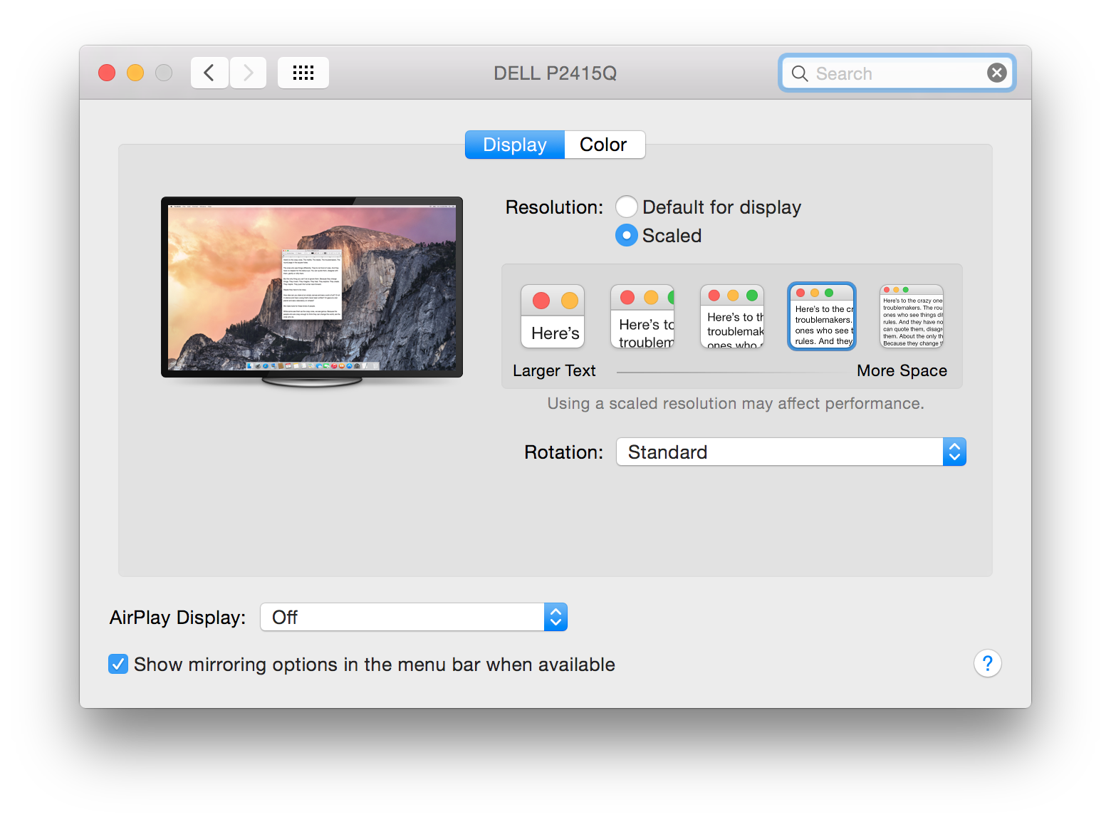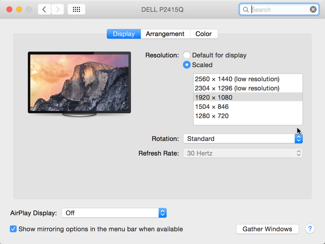 After connecting the P2415Q via the supplied MDP to DP cable, the best resolution I could get was 2560/1440, a 50% improvement over the 1080p I was getting with my old Dell monitor, but still not the resolution I thought I would get with the 2415Q, given the specs of both the rMBP and the Dell. I increased the sharpness on the monitor, which helped some, but not enough. I tried all sorts of resolution changes using SwitchResX, again no help, and the custom 2560/1600 i created wouldn't even display--gave me a blank screen on the Dell.