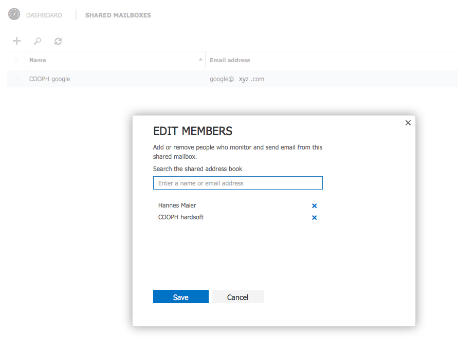 Maybe the setting of the shared mailbox is not correct? This is how i have set that up in the office admin console. where Hannes Maier and COOPH hardsoft, both have access to that shared mailbox.