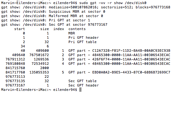 gpt show: /dev/disk0: Pri GPT at sector 1