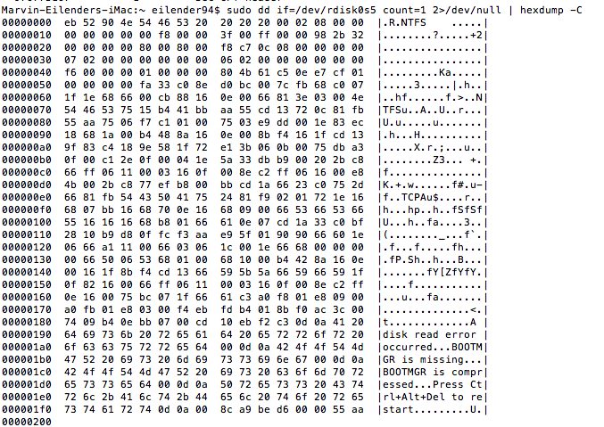 sudo dd if=/dev/rdisk0s5 count=1 2>/dev/null | hexdump -C