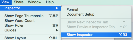 Move the mouse pointer to "Inspector", then choose "Show Inspector" from the po-up.
