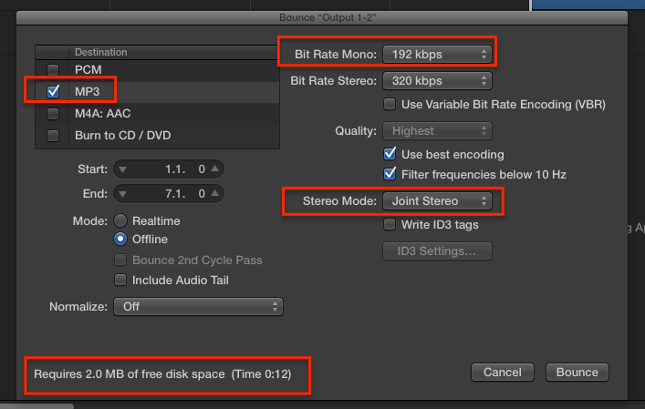 - What you see in the Bounce Window at the bottom is the required disk space for the PCM (aiff) file not the ,p3 file.