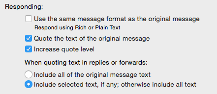 I just noticed that I am unable to include just the selected text in either a reply or forward to an email. This seems to have happened after the Yosemite 10.10.2 update. I have the correct settings in preferences (see screenshot below). However, the option doesn't work, and all replies and forwards include the entire message text regardless of what is selected. When I reboot the Mail app, it reverts to the other option (Include all of the original message text). Anyone seen this? How can I fix it?