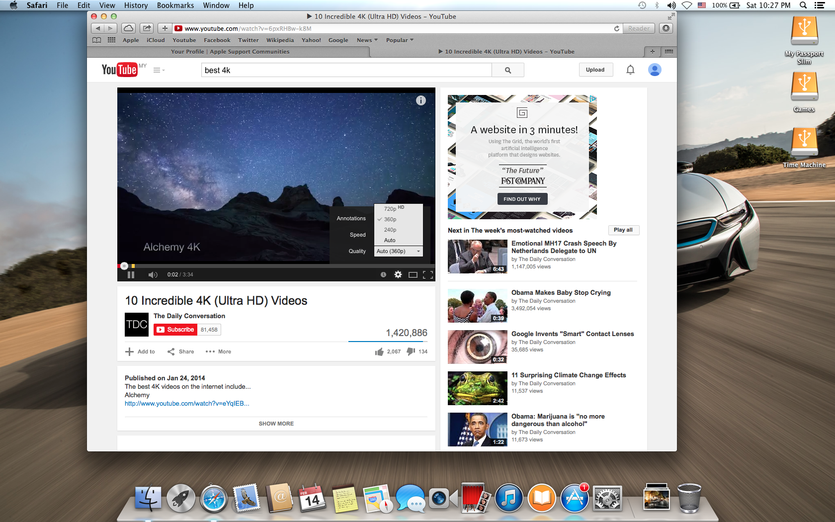 safari is latest 7.1.3, but youtube ably play 240p, 360p, 720p,