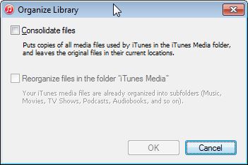 click the Consolidate files check box and - if its not greyed out - the Reorganize files ... check box. Then click OK - this will move any media files that are linked from your iTunes library to other locations to the standard folder structure under the iTunes Media folder,