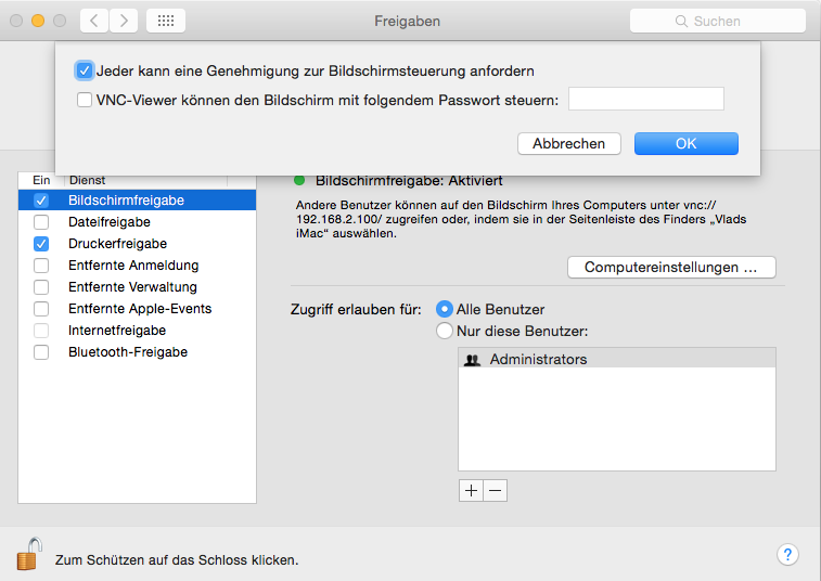 P.S. My IP address is 93.213.68.226. Previously I opened the port 5900 as suggested. I've just opened the screensharing settings: