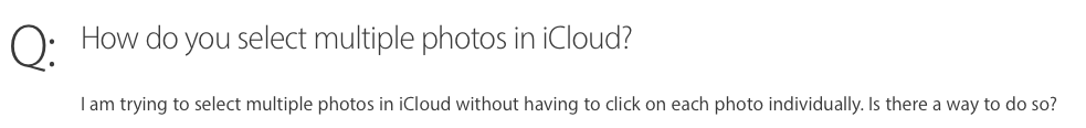 Thanks for the feedback, Larry. However, I would encourage you to consider this from a user experience point of view. I came to this discussion thread using the google search "icloud select multiple photos". This discussion is the first result for that search, so I clicked on it expecting an answer. I suspect many people with this issue will arrive the same way.