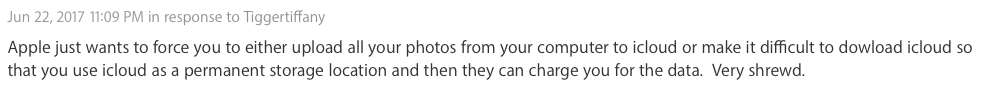 And for anyone that tries to explain to me what the purpose of icloud is (just to browse photos), I get it. I use Photoshop and Lightroom but when my photos are being saved in "optimize" mode, then they dont show up in those programs!