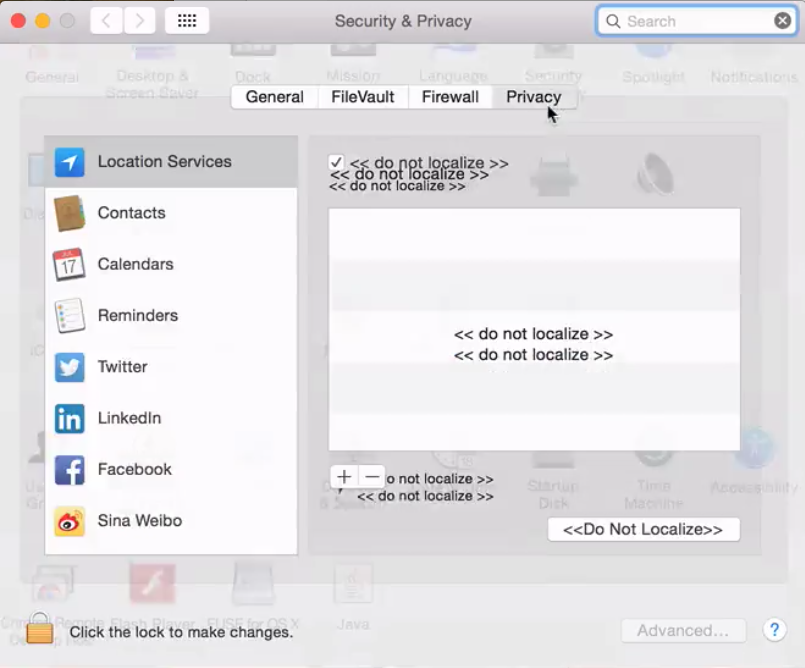 Also, all this << do not localize >> stuff indicates a problem. I don't necessarily have privacy concerns, but something odd is going on. What happens when you click the lock to make changes and select the Sina Weibo area?
