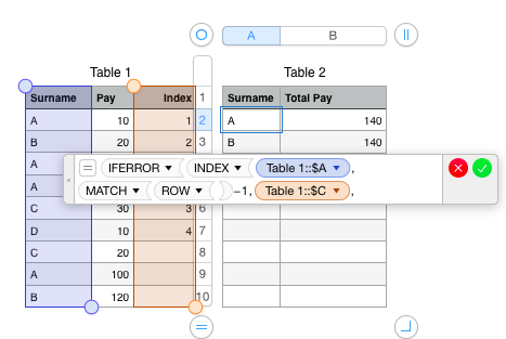 Table 2 (excerpt) A1 Surname A2 =IFERROR(INDEX(Table 1::A,C2,1),"") A3 =IFERROR(INDEX(Table 1::A,C3,1),"") A4 =IFERROR(INDEX(Table 1::A,C4,1),"") A5 =IFERROR(INDEX(Table 1::A,C5,1),"") B1 Total Pay B2 =IF(A<>"",SUMIF(Table 1::A,A2,Table 1::B),"") B3 =IF(A<>"",SUMIF(Table 1::A,A3,Table 1::B),"") B4 =IF(A<>"",SUMIF(Table 1::A,A4,Table 1::B),"") B5 =IF(A<>"",SUMIF(Table 1::A,A5,Table 1::B),"") C1 index C2 =IFERROR(MATCH(1,Table 1::C,0),"") C3 =IFERROR(MATCH(1,OFFSET(Table 1::C,C2,0,ROWS(Table 1::C)-C2,1),0)+C2,"") C4 =IFERROR(MATCH(1,OFFSET(Table 1::C,C3,0,ROWS(Table 1::C)-C3,1),0)+C3,"") C5 =IFERROR(MATCH(1,OFFSET(Table 1::C,C4,0,ROWS(Table 1::C)-C4,1),0)+C4,"")