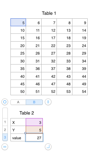 =OFFSET(Table 1::A1, B2−1, B1−1)