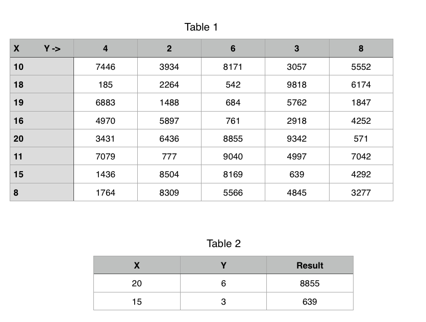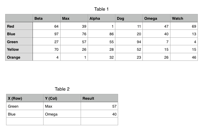 This seems to be basic, but I can't find my solution. I have two values, X and Y. I simply want to look down the first column of rows searching for X. Then I want to stop there, and look across the top row, looking for value Y. Where X and Y cross, I'l like to return that value.