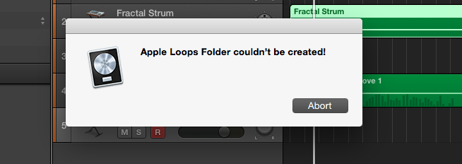 Logic will let me enter all the descriptor information on the loop, acoustic or electronic, dry or processed, etc. All looks like it's working. But then I click the create button and I get the above error message: Apple Loops folder couldn't be created, along with an "abort" button. Which is the only choice.