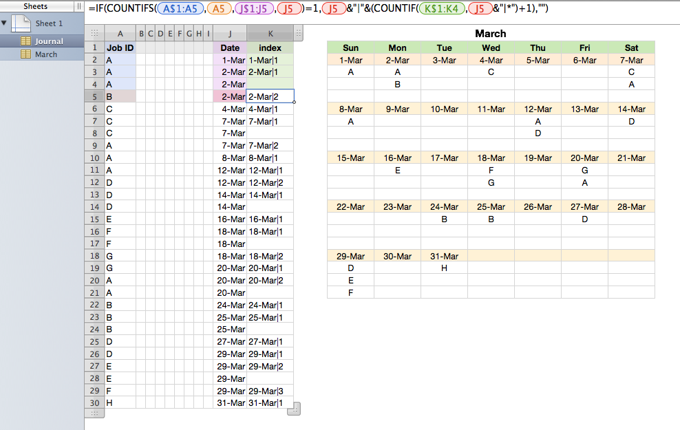 Journal (excerpt) A1 Job ID A2 A A3 A A4 A A5 B J1 Date J2 2015-03-01 J3 2015-03-02 J4 2015-03-02 J5 2015-03-02 K1 index K2 =IF(COUNTIFS(A$1:A2,A2,J$1:J2,J2)=1,J2&"|"&(COUNTIF(K$1:K1,J2&"|*")+1),"") K3 =IF(COUNTIFS(A$1:A3,A3,J$1:J3,J3)=1,J3&"|"&(COUNTIF(K$1:K2,J3&"|*")+1),"") K4 =IF(COUNTIFS(A$1:A4,A4,J$1:J4,J4)=1,J4&"|"&(COUNTIF(K$1:K3,J4&"|*")+1),"") K5 =IF(COUNTIFS(A$1:A5,A5,J$1:J5,J5)=1,J5&"|"&(COUNTIF(K$1:K4,J5&"|*")+1),"")