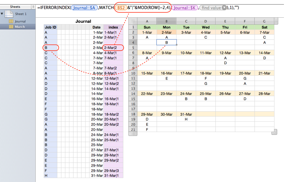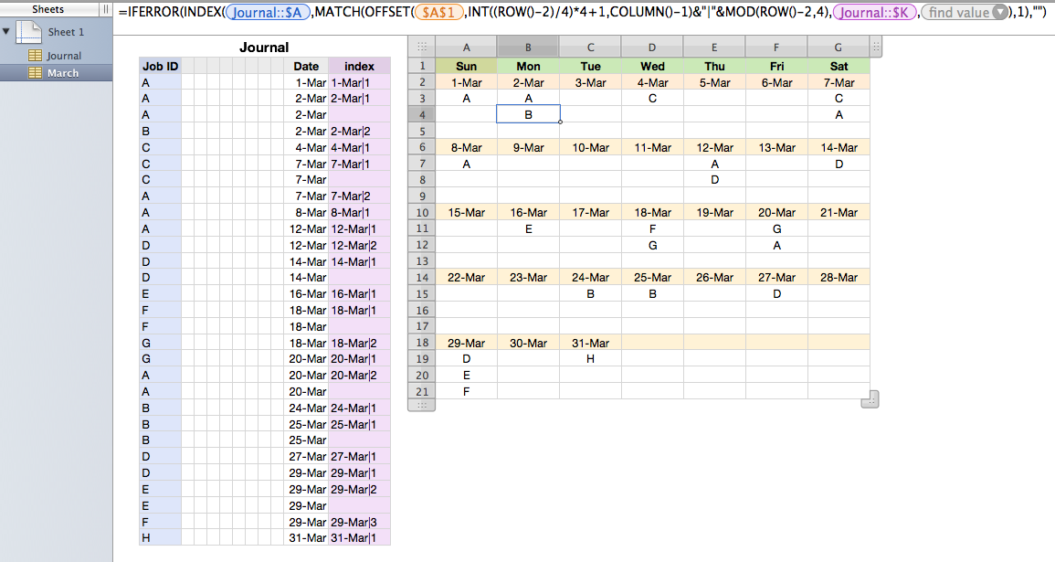 March (excerpt) A1 Sun A2 2015-03-01 A3 =IFERROR(INDEX(Journal::$A,MATCH(A$2&"|"&MOD(ROW()-2,4),Journal::$K,0),1),"") A4 =IFERROR(INDEX(Journal::$A,MATCH(A$2&"|"&MOD(ROW()-2,4),Journal::$K,0),1),"") A5 =IFERROR(INDEX(Journal::$A,MATCH(A$2&"|"&MOD(ROW()-2,4),Journal::$K,0),1),"") A6 2015-03-08 A7 =IFERROR(INDEX(Journal::$A,MATCH(A$6&"|"&MOD(ROW()-2,4),Journal::$K,0),1),"") A8 =IFERROR(INDEX(Journal::$A,MATCH(A$6&"|"&MOD(ROW()-2,4),Journal::$K,0),1),"") A9 =IFERROR(INDEX(Journal::$A,MATCH(A$6&"|"&MOD(ROW()-2,4),Journal::$K,0),1),"") B1 Mon B2 2015-03-02 B3 =IFERROR(INDEX(Journal::$A,MATCH(B$2&"|"&MOD(ROW()-2,4),Journal::$K,0),1),"") B4 =IFERROR(INDEX(Journal::$A,MATCH(B$2&"|"&MOD(ROW()-2,4),Journal::$K,0),1),"") B5 =IFERROR(INDEX(Journal::$A,MATCH(B$2&"|"&MOD(ROW()-2,4),Journal::$K,0),1),"") B6 2015-03-09 B7 =IFERROR(INDEX(Journal::$A,MATCH(B$6&"|"&MOD(ROW()-2,4),Journal::$K,0),1),"") B8 =IFERROR(INDEX(Journal::$A,MATCH(B$6&"|"&MOD(ROW()-2,4),Journal::$K,0),1),"") B9 =IFERROR(INDEX(Journal::$A,MATCH(B$6&"|"&MOD(ROW()-2,4),Journal::$K,0),1),"") C1 Tue C2 2015-03-03 C3 =IFERROR(INDEX(Journal::$A,MATCH(C$2&"|"&MOD(ROW()-2,4),Journal::$K,0),1),"") C4 =IFERROR(INDEX(Journal::$A,MATCH(C$2&"|"&MOD(ROW()-2,4),Journal::$K,0),1),"") C5 =IFERROR(INDEX(Journal::$A,MATCH(C$2&"|"&MOD(ROW()-2,4),Journal::$K,0),1),"") C6 2015-03-10 C7 =IFERROR(INDEX(Journal::$A,MATCH(C$6&"|"&MOD(ROW()-2,4),Journal::$K,0),1),"") C8 =IFERROR(INDEX(Journal::$A,MATCH(C$6&"|"&MOD(ROW()-2,4),Journal::$K,0),1),"") C9 =IFERROR(INDEX(Journal::$A,MATCH(C$6&"|"&MOD(ROW()-2,4),Journal::$K,0),1),"") D1 Wed D2 2015-03-04 D3 =IFERROR(INDEX(Journal::$A,MATCH(D$2&"|"&MOD(ROW()-2,4),Journal::$K,0),1),"") D4 =IFERROR(INDEX(Journal::$A,MATCH(D$2&"|"&MOD(ROW()-2,4),Journal::$K,0),1),"") D5 =IFERROR(INDEX(Journal::$A,MATCH(D$2&"|"&MOD(ROW()-2,4),Journal::$K,0),1),"") D6 2015-03-11 D7 =IFERROR(INDEX(Journal::$A,MATCH(D$6&"|"&MOD(ROW()-2,4),Journal::$K,0),1),"") D8 =IFERROR(INDEX(Journal::$A,MATCH(D$6&"|"&MOD(ROW()-2,4),Journal::$K,0),1),"") D9 =IFERROR(INDEX(Journal::$A,MATCH(D$6&"|"&MOD(ROW()-2,4),Journal::$K,0),1),"") E1 Thu E2 2015-03-05 E3 =IFERROR(INDEX(Journal::$A,MATCH(E$2&"|"&MOD(ROW()-2,4),Journal::$K,0),1),"") E4 =IFERROR(INDEX(Journal::$A,MATCH(E$2&"|"&MOD(ROW()-2,4),Journal::$K,0),1),"") E5 =IFERROR(INDEX(Journal::$A,MATCH(E$2&"|"&MOD(ROW()-2,4),Journal::$K,0),1),"") E6 2015-03-12 E7 =IFERROR(INDEX(Journal::$A,MATCH(E$6&"|"&MOD(ROW()-2,4),Journal::$K,0),1),"") E8 =IFERROR(INDEX(Journal::$A,MATCH(E$6&"|"&MOD(ROW()-2,4),Journal::$K,0),1),"") E9 =IFERROR(INDEX(Journal::$A,MATCH(E$6&"|"&MOD(ROW()-2,4),Journal::$K,0),1),"") F1 Fri F2 2015-03-06 F3 =IFERROR(INDEX(Journal::$A,MATCH(F$2&"|"&MOD(ROW()-2,4),Journal::$K,0),1),"") F4 =IFERROR(INDEX(Journal::$A,MATCH(F$2&"|"&MOD(ROW()-2,4),Journal::$K,0),1),"") F5 =IFERROR(INDEX(Journal::$A,MATCH(F$2&"|"&MOD(ROW()-2,4),Journal::$K,0),1),"") F6 2015-03-13 F7 =IFERROR(INDEX(Journal::$A,MATCH(F$6&"|"&MOD(ROW()-2,4),Journal::$K,0),1),"") F8 =IFERROR(INDEX(Journal::$A,MATCH(F$6&"|"&MOD(ROW()-2,4),Journal::$K,0),1),"") F9 =IFERROR(INDEX(Journal::$A,MATCH(F$6&"|"&MOD(ROW()-2,4),Journal::$K,0),1),"") G1 Sat G2 2015-03-07 G3 =IFERROR(INDEX(Journal::$A,MATCH(G$2&"|"&MOD(ROW()-2,4),Journal::$K,0),1),"") G4 =IFERROR(INDEX(Journal::$A,MATCH(G$2&"|"&MOD(ROW()-2,4),Journal::$K,0),1),"") G5 =IFERROR(INDEX(Journal::$A,MATCH(G$2&"|"&MOD(ROW()-2,4),Journal::$K,0),1),"") G6 2015-03-14 G7 =IFERROR(INDEX(Journal::$A,MATCH(G$6&"|"&MOD(ROW()-2,4),Journal::$K,0),1),"") G8 =IFERROR(INDEX(Journal::$A,MATCH(G$6&"|"&MOD(ROW()-2,4),Journal::$K,0),1),"") G9 =IFERROR(INDEX(Journal::$A,MATCH(G$6&"|"&MOD(ROW()-2,4),Journal::$K,0),1),"")
