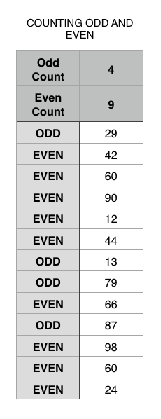 and, the expression for counting even results is: =COUNTIF(A, "EVEN")