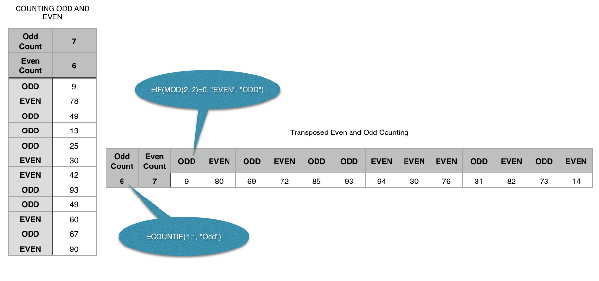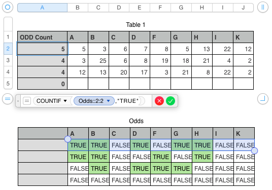 The expression for counting odd results is: =COUNTIF(A, "ODD")