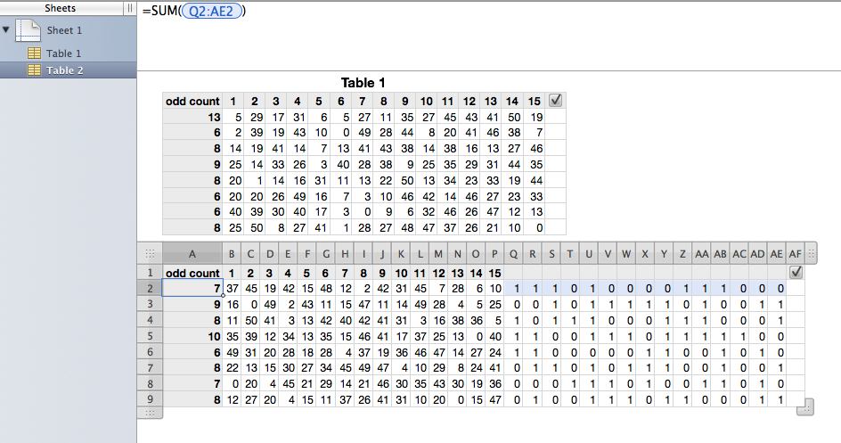 Table 2 (excerpt) A2 =SUM(Q2:AE2) B2 =RANDBETWEEN(0,50) C2 =RANDBETWEEN(0,50) D2 =RANDBETWEEN(0,50) E2 =RANDBETWEEN(0,50) F2 =RANDBETWEEN(0,50) G2 =RANDBETWEEN(0,50) H2 =RANDBETWEEN(0,50) I2 =RANDBETWEEN(0,50) J2 =RANDBETWEEN(0,50) K2 =RANDBETWEEN(0,50) L2 =RANDBETWEEN(0,50) M2 =RANDBETWEEN(0,50) N2 =RANDBETWEEN(0,50) O2 =RANDBETWEEN(0,50) P2 =RANDBETWEEN(0,50) Q2 =MOD(B2,2) R2 =MOD(C2,2) S2 =MOD(D2,2) T2 =MOD(E2,2) U2 =MOD(F2,2) V2 =MOD(G2,2) W2 =MOD(H2,2) X2 =MOD(I2,2) Y2 =MOD(J2,2) Z2 =MOD(K2,2) AA2 =MOD(L2,2) AB2 =MOD(M2,2) AC2 =MOD(N2,2) AD2 =MOD(O2,2) AE2 =MOD(P2,2)